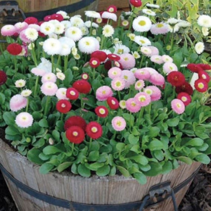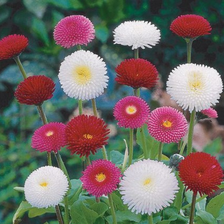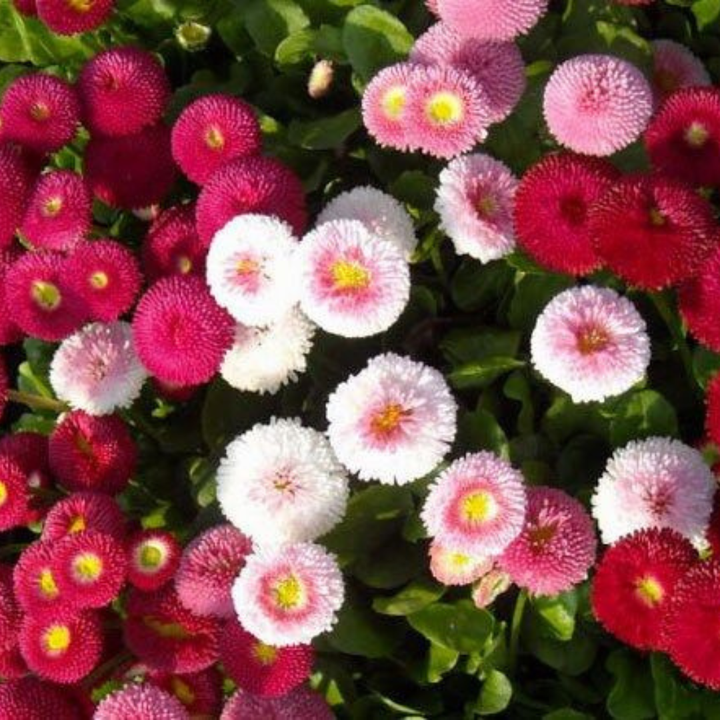 Bellis perennis 'Pomponette Mixed' is a variety of English daisy that produces pompon-like double flowers in a mix of pink, red, and white. This compact, hardy perennial is ideal for garden beds, borders, and containers, blooming in early spring for a burst of color. The 'Pomponette' daisy is a perennial with spoon-shaped, dark green leaves. |