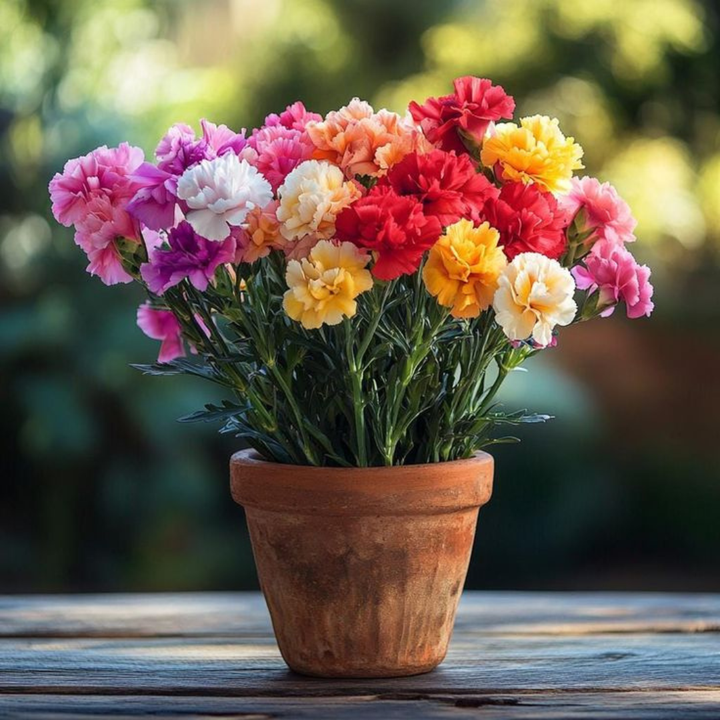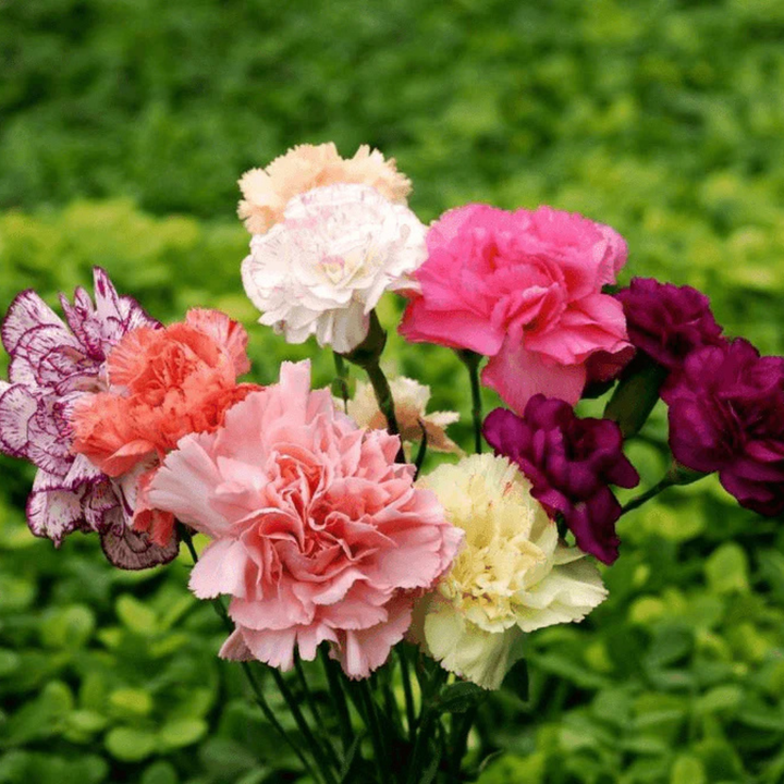 Chabaud carnations feature large, double, ruffled flowers that appear in a rich mix of colors, including pink, red, white, yellow, and bicolors.