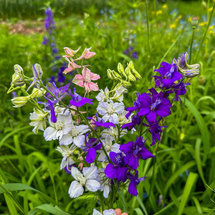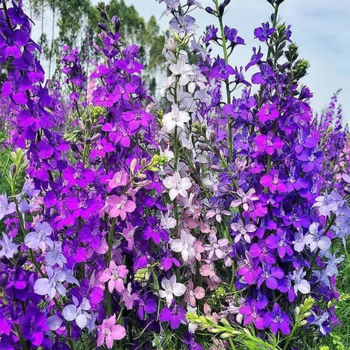 Larkspur refers to flowering plants from either the Delphinium or Consolida genera, which are both in the buttercup family. These elegant, spire-shaped flowers are known for their vibrant colors and are a classic feature of cottage gardens and floral arrangements. These tall, spiky flowers, which come in shades of blue, purple, pink, and white, thrive in cool temperatures