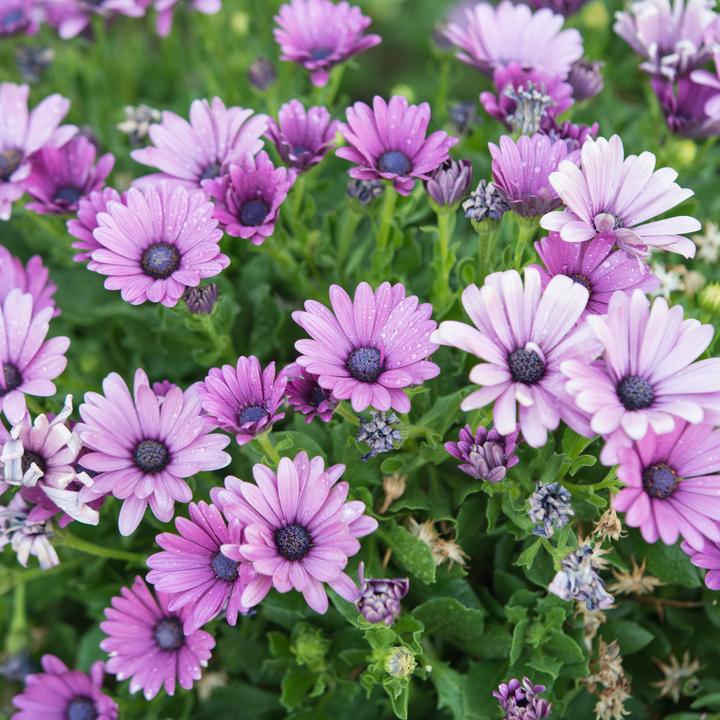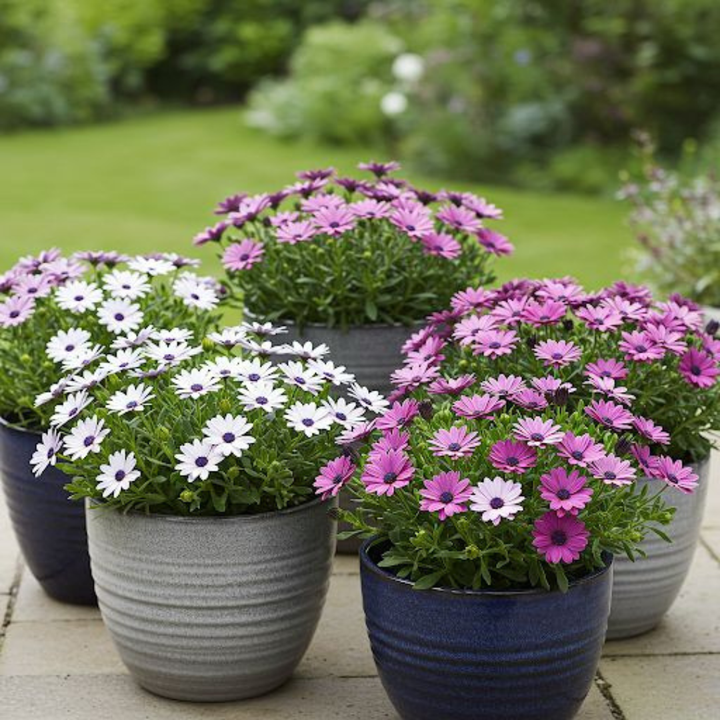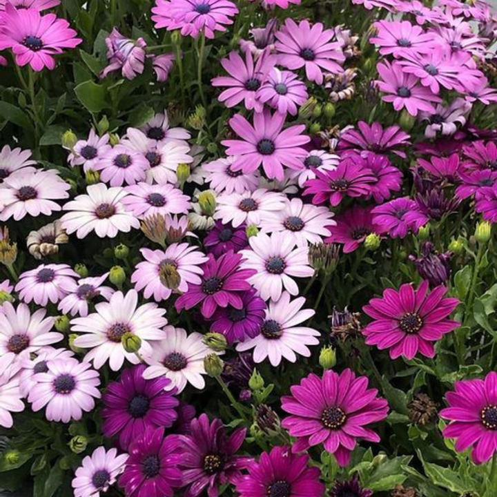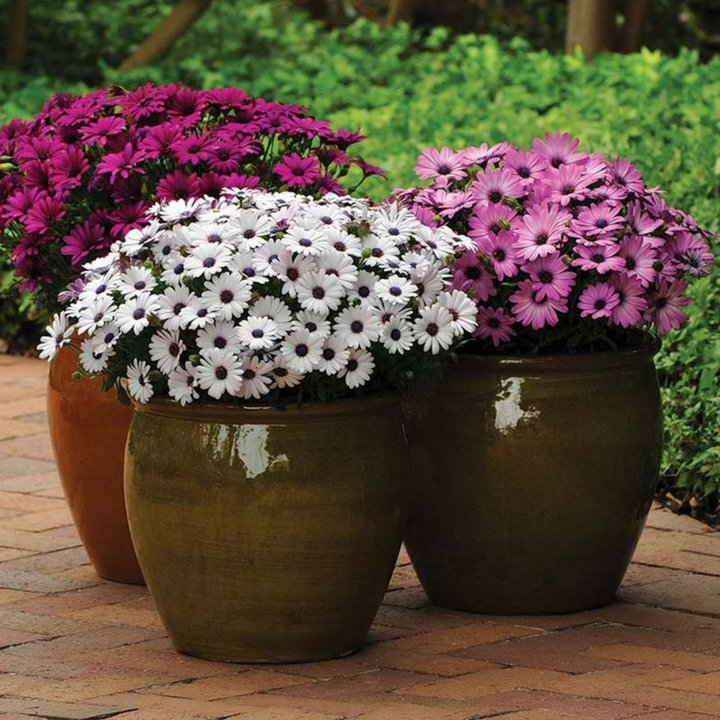 Osteospermum ecklonis mixed, also known as African or Cape Daisies, are a vibrant mix of flowering plants cherished for their daisy-like blooms and ability to thrive in sunny locations. These tender perennials are often grown as annuals, particularly in colder climates. in a mix of colors such as red, pink, purple, yellow, and white