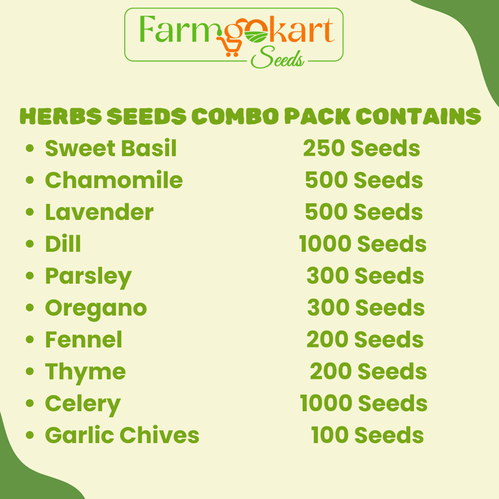• Includes 10 Varieties of Herb Seeds Sweet Basil, Parsley ,Oregano ,Thyme , Garlic Chives , Chamomile, Lavender, Dill, Celery and Fennel
