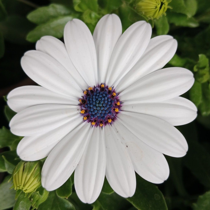 White or yellowish petals that can have blue or purple markings, particularly on the undersides and near the center. The central disc flowers are often white or yellowish with purple tips.